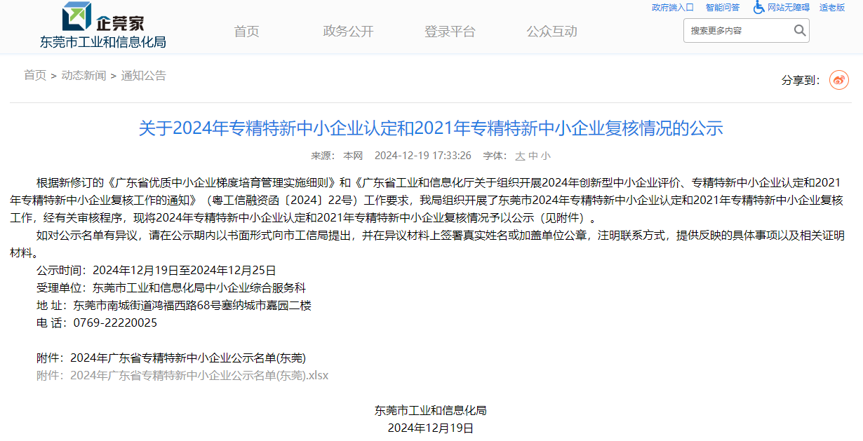 近日,东莞市工业和信息化局发布了《关于2024年专精特新中小企业认定和2021年专精特新中小企业复核情况的公示》,米兰milan高能顺利通过广东省专精特新中小企业复核。
